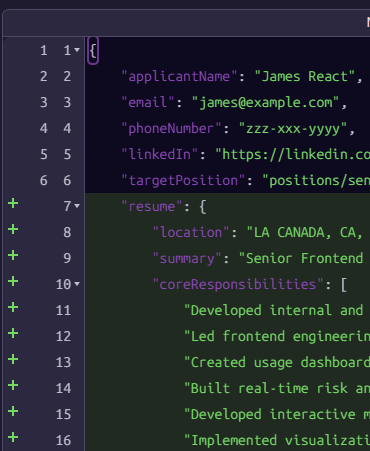 Next, note that we output multiple contexts for the same document. Here is what this looks like for James, we have two separate contexts, one for each position James applied for: