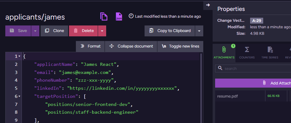 Note that we are not actually doing a lot here in terms of the data we ask the applicant to provide. We mostly gather the contact information and ask them to attach their resume. You can see the resume attachment in RavenDB Studio. In the above screenshot, it is in the right-hand Attachments pane of the document view.